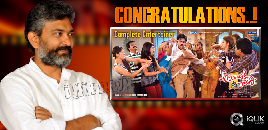 Rajamouli, who is on high after releasing the making video of his directorial venture Baahubali starring Prabhas and Anushka, has now congratulated the team of Attarintiki Daredi on his micro blogging site. As per the latest reports it is known that Attarintiki Daredi film has broken the All-Time record set by Rajamouli’s Magadheera in 2009.