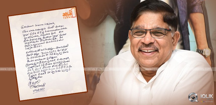 In a hand-written note to the audiences, Allu Aravind thanked the audiences, Aha team and his partners. Aha Twitter team shared the letter and wrote, "A day ahead of our birthday, our promoter #AlluArvind garu wanted to THANK YOU each and every one of you personally! And he sat down to write this.